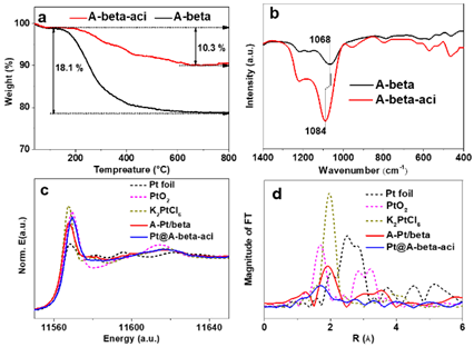作者首先将水热合成后的beta分子筛使用酸洗去除部分模板剂,同时构建离子传输通道。在此基础上采用离子交换法,利用beta分子筛中孔道交叉处存在的模板剂分子(TEA+)与金属离子(PtCl62-)的静电结合作用,将金属离子区域选择性引入分子筛内部。结合表征发现,模板剂分子与引入的金属离子间存在的强相互作用(Pt-O/N),可抑制金属在制备过程中高温处理导致的团聚效应。通过后续直接还原处理,制备出了具有高分散金属特性的beta分子筛封装金属Pt催化剂(Pt@beta)。