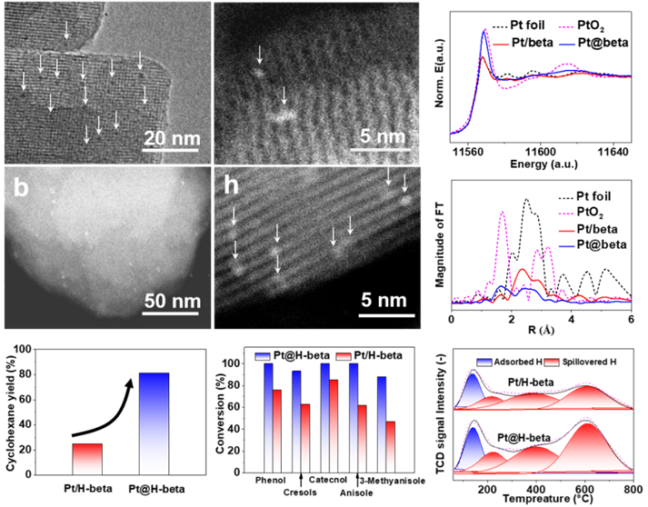 作者选用酚类化合物加氢脱氧作为模型反应,考察了beta分子筛封装Pt催化剂的催化性能。发现Pt@H-beta催化活性较渍法制备的对比催化剂显著提高。以愈创木酚作为模型化合物,130 °C反应210分钟后,目标产物环己烷收率(81.1%)显著高于对比催化剂,且对多种酚类化合物的高效转化普遍适用。结合表征,作者认为采用模板剂诱导策略合成的Pt@beta催化剂中,高分散金属Pt与分子筛骨架中的O间存在强相互作用。这将有助于活性H物种在金属Pt-zeolite间的传递,促进吸附在酸性位点的酚类化合物通过先加氢-后脱氧的过程发生转化。