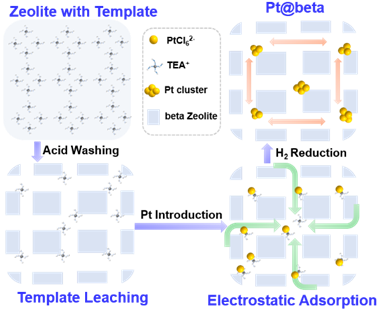 田亚杰博士、材料学院赵勇教授团队,与天津大学化工学院刘国柱教授团队合作,利用“模板剂定向诱导”策略,通过利用预合成分子筛中模板剂与金属离子的静电结合过程,实现了由低硅(Si/Al=15)到高硅(Si/Al=200)条件下,beta分子筛孔道交叉处定向封装亚纳米Pt金属颗粒催化剂的可控制备。