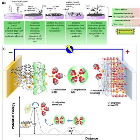 锂金属阳极凭借3860 mAh g⁻¹的理论容量(石墨的10倍)和最低电化学电位(-3.04 V),成为高能量密度电池的理想选择。然而,低温环境下电解质粘度升高、离子电导率骤降,导致电池性能急剧衰退。锂金属电池的固有缺陷:高反应性、体积膨胀及不稳定的固体电解质界面(SEI),而本文揭示了锂离子在低温充电过程中的迁移障碍,其中脱溶剂化过程成为主要能垒。