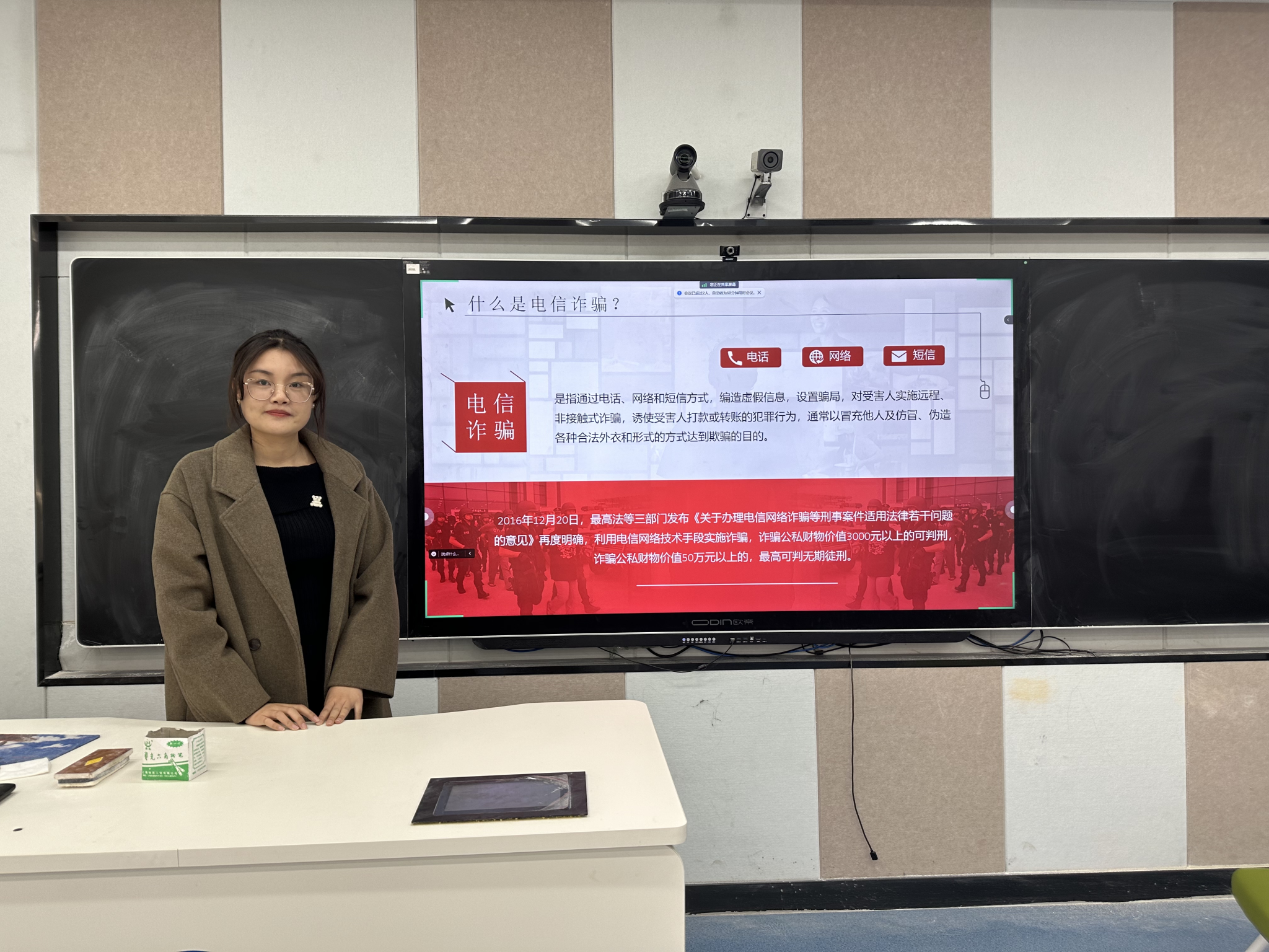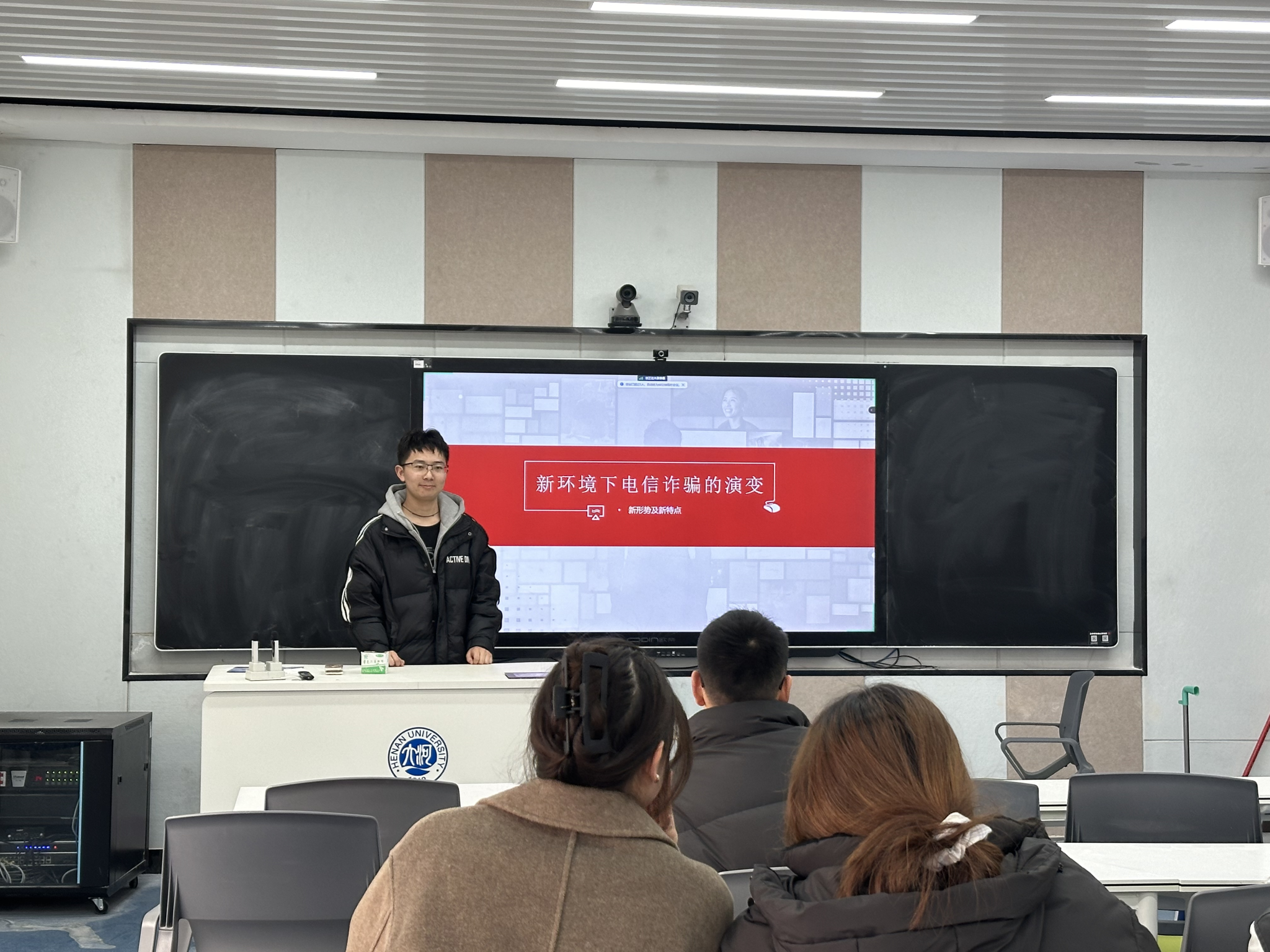 庞老师结合家教诈骗、电信诈骗、贷款诈骗、熟人诈骗等高校大学生常见诈骗手段,介绍了各类诈骗的特征特点,并通过大学生真实经历的各类案例具体讲解了大学生防范诈骗的具体方法。同时,也从法律的角度,提醒同学们防范诈骗于未然。两位2023级研究生任爽婷和陈晓舟也分享最近的电信诈骗案件作为补充。